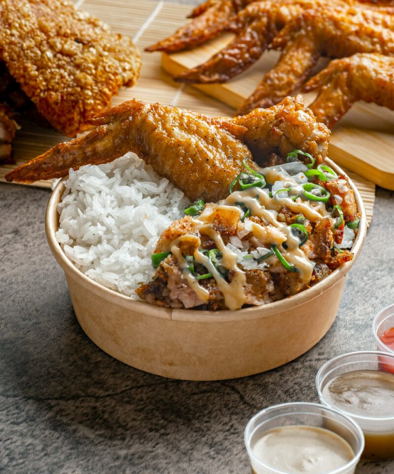 Crispy sisig paired with 2 pcs baked chicken wings. Choose 1 sauce topping for your wings.